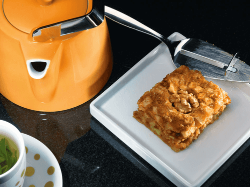 Take out the form after twenty minutes, cut into even pieces with a knife, and decorate each piece with walnuts. Bake for another 5-7 minutes.