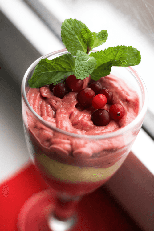 3rd layer, top - cranberry: blend cranberries (rinse if necessary) and 1 fresh banana in a blender and pour into glasses.