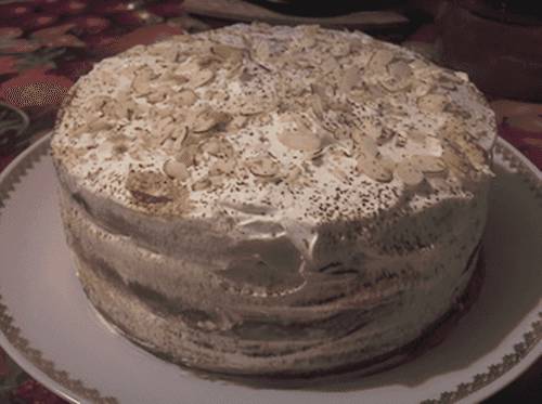 Assemble the cake and decorate as desired (for example, with almond flakes and cocoa).