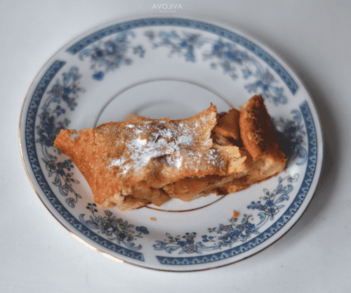 Apple strudel with raisins and cinnamon is a true symbol of Austrian cuisine, with a history dating back to the Austro-Hungarian Empire. The crispy puff pastry gently wraps a delicate filling of caramelized apples infused with brandy, sweet raisins, and spicy cinnamon. Almonds add a nutty richness to the strudel, while breadcrumbs help maintain the perfect texture. Traditionally served with vanilla sauce or a scoop of ice cream, this dessert is ideal for cozy family gatherings. Sweet and spicy, it brings warmth and memories of old Viennese cafes where it is served with a cup of aromatic coffee. Each bite offers a harmony of flavors and centuries of heritage.