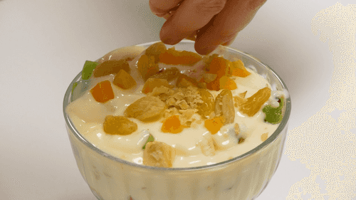 Sprinkle with dried apricots, raisins, and walnuts on top.