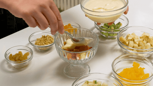 Layer the sliced fruits in a salad bowl or individual cups, spreading yogurt between every other layer.