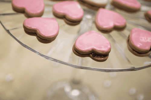 Place the dough on a sheet of foil and spread it to a thickness of 1 cm. Use a heart-shaped cutter to cut out buns. Re-flatten the remaining dough and repeat the same. Cut each heart in half horizontally. Spread jam on the bottom halves and cover with the top halves. Transfer to a baking tray and bake for about 18 minutes until golden. Transfer to a plate and let cool slightly.