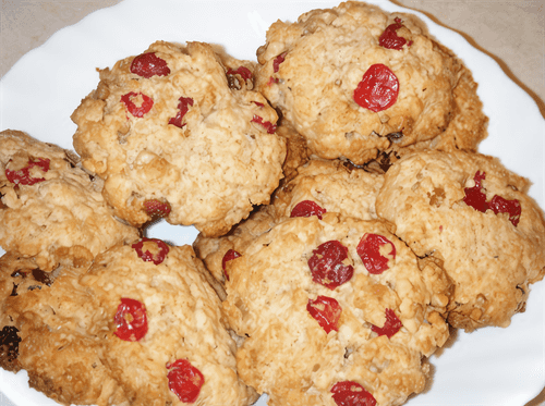 Cream the butter with sugar. Add flour with baking powder, oats, a pinch of salt, nuts, raisins, and cranberries. Beat an egg into the mixture and mix well.