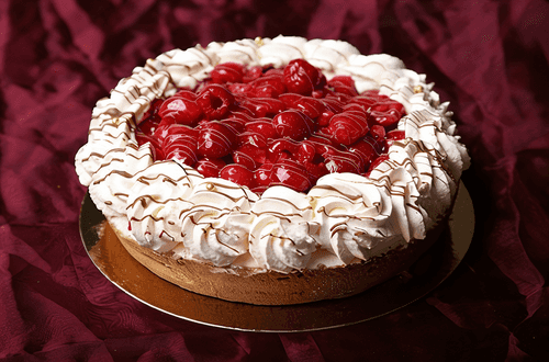 To assemble the pie, place one layer on a plate. Evenly spread half of the whipped cream and some of the remaining raspberries on this layer, then cover with the second layer. Spread whipped cream evenly on the surface of the second layer and decorate with raspberries.