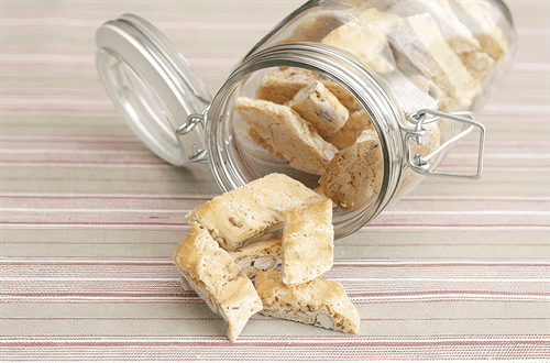 Send the dough to an oven preheated to 175 degrees and bake until golden brown for about 30 minutes. Then remove from the oven, let it cool completely, and slice into pieces about 2 cm thick with a serrated knife.