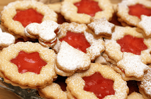 Let the baked cookies cool completely. Divide the cookies into two equal parts. Spread raspberry jam on one part, cover with the remaining cookie, press lightly to stick them together, and dust with powdered sugar on top.