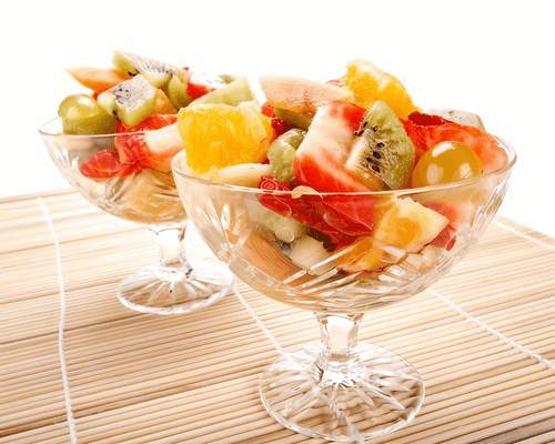 Place all the peeled and chopped fruits and berries (except pomegranate seeds) in a large glass bowl, pour orange juice over them, and mix.