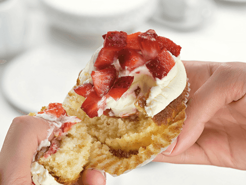 Make a hole in the center of the cupcake, remove the core, and fill the cavity with rhubarb and strawberry puree. Top with cream and decorate with fresh strawberries.