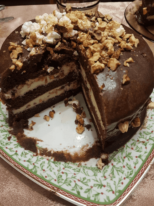 The 'Prague' cake is a true masterpiece of pastry art, infused with history and elegance. Despite its name, its roots lie not in Italy but in the Czech Republic, where it was created in the 20th century by talented pastry chefs. This dessert is a combination of delicate chocolate layers soaked in a fragrant cream made from semolina and cognac, giving the cake sophistication. Walnuts add texture and a slight bitterness, while the thick chocolate glaze completes the composition with a rich flavor. 'Prague' is the perfect treat for festive occasions as its velvety structure and harmonious blend of sweetness and rich chocolate notes leave an unforgettable impression.