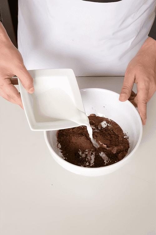 Gradually add the sifted flour, starch, and cocoa. Carefully mix the dough with a spoon, lifting it layer by layer until it absorbs the flour.