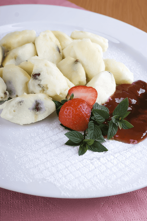 Divide the dough into dumplings. Make a dent in each dumpling with your finger and place plum jam inside. Seal the edges of the dumpling.