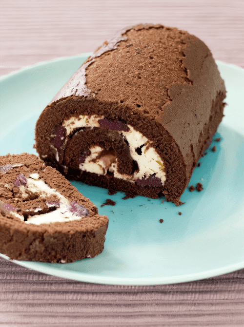 Before serving, whip the cream and add brandy. Spread the cream on the cake layer. Top with cherries, removing the pits beforehand. Roll it into a log. Place it on a plate.