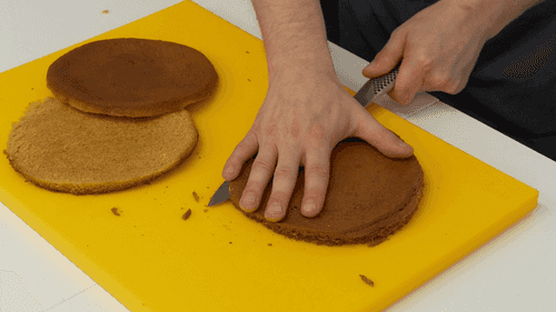 Cut the ready-made layers into 2 parts and trim the sides. Poke all the sour cream layers, except for the bottom one, with a fork to absorb the cream better.