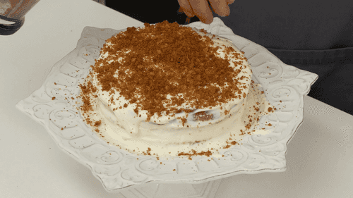 Crush the cake scraps into crumbs and sprinkle them over the sour cream cake.