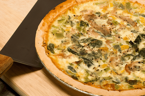 Reduce the oven temperature to 150 – 170 degrees. Mix the eggs, yolk, cream, and remaining parmesan. Place the filling in the pie dish, season with salt and pepper, and pour in the egg mixture.