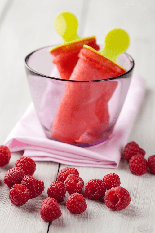 Pour the yogurt mixture into long popsicle molds, then pour raspberry syrup on top. Gently stir the mixture with a knife, but do not make it uniform. Insert wooden sticks and freeze for 6 hours or until solid.