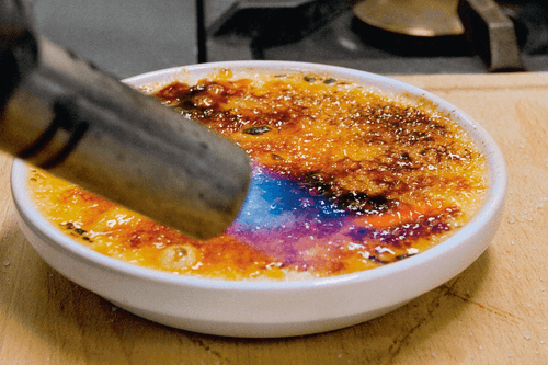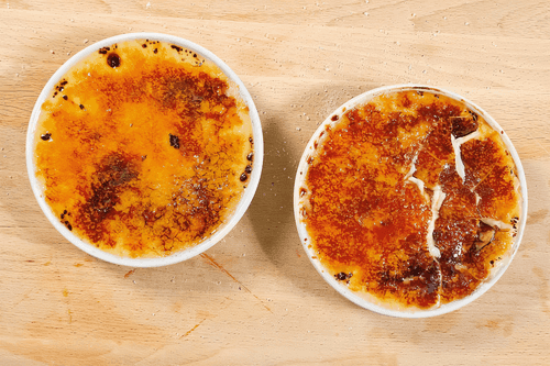 The top of the finished crème brûlée should be firm, while the inside remains slightly liquid. Place the bowls in the refrigerator for a couple of hours — the cream should thicken there. To achieve a caramel crust, sprinkle the molds with an even layer of sugar and, using a torch, turn the surface of the cream into a dark brown caramel lid.