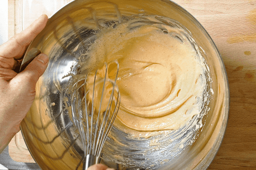 Add 180 grams of sugar to nine egg yolks (the whites are not needed) and whisk. The mixture will change color from bright yellow to sandy white. While whisking, be sure to incorporate the edges of the mixture — the yolks will slowly start to 'cook' due to the sugar, and if not removed, the taste of the crème brûlée will be incorrect.
