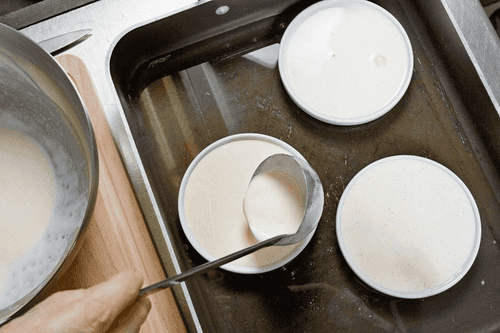 Place the ramekins in a deep ovenproof dish and fill with water so that the cups are submerged two-thirds of their height. Then pour the egg-cream mixture into the ramekins, filling them to the brim. Place the dish in an oven preheated to 100 degrees for forty minutes.