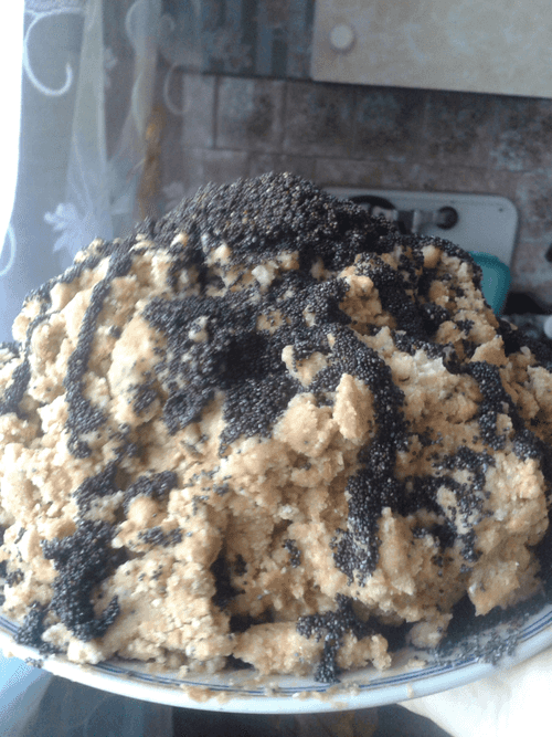 Carefully mix the baked dough with condensed milk, form a mound, and pour honey with poppy seeds over it.
