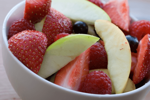 Add blueberries, sliced strawberries, and peeled, chopped apples. Mix and let sit for 15 minutes.
