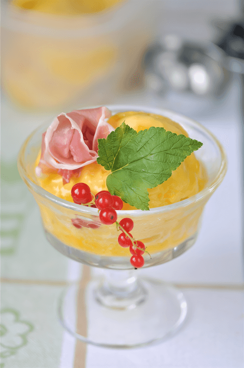 Melon sorbet with prosciutto di Parma is an exquisite blend of sweetness and saltiness born in sunny Italy. The delicate, refreshing sorbet made from ripe melon gains harmonious depth from honey, wine, and lime juice. Its velvety texture beautifully contrasts with thin slices of prosciutto, adding a light spiciness and refined aftertaste to the dish. Fresh mint completes the composition with bright notes of freshness. This dessert is perfect as an elegant appetizer or a light finish to a meal on a summer evening. It should be prepared in advance for the sorbet to reach the ideal consistency. The simplicity of the ingredients makes the dish accessible while its taste is unforgettable—a true delight for those who appreciate culinary art!