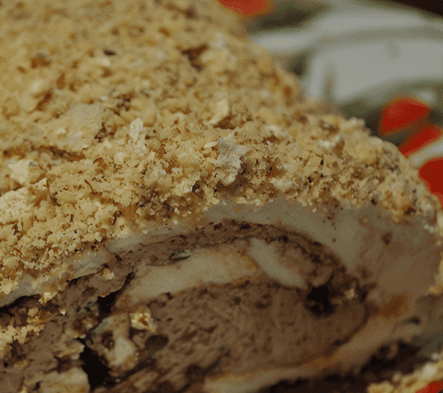 Pavlova roll with coffee and hazelnuts