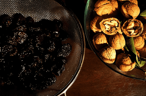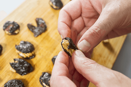 Carefully cut a small slit in the side of the prunes with a sharp knife and hide half a peeled walnut inside. Do the same with all the prunes.