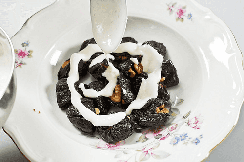 The recipe for prunes stuffed with walnuts, known since Soviet times, does not look quite like this one. In the classic, so to speak, version, the fruit is not usually drizzled, but poured with sour cream mixed with a generous portion of sugar or condensed milk, so that they literally drown in it. Here, sour cream plays more of a role as a sauce, and this has a very pleasant effect on the calorie content of the dessert. In Soviet times, this dessert often adorned New Year's tables, and it was usually served as an appetizer - along with Olivier salad, herring under a fur coat and sprats.