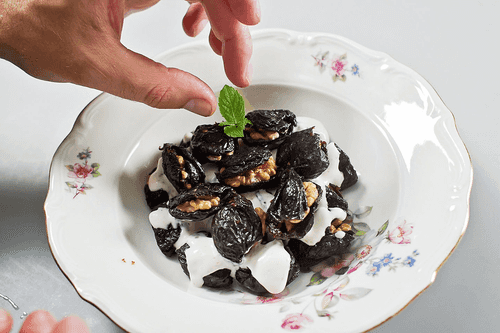 Place the dish with prunes in the refrigerator for a while and let the prunes soak in the cream. Ideally, it should be chilled for several hours or even overnight — in the latter case, it's best to garnish the prunes with mint just before serving.