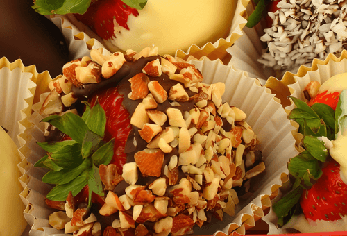 Strawberries in chocolate and crunchy peanuts