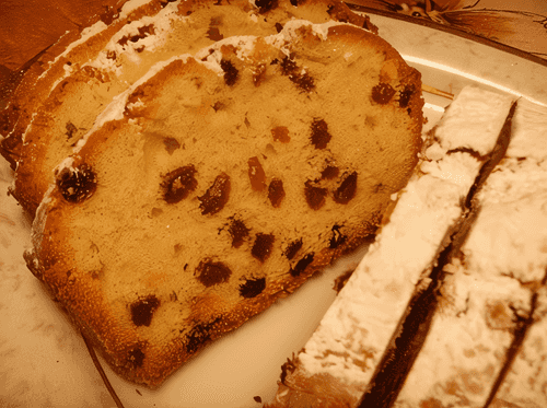 First, beat the margarine with sugar until fluffy. Then, while continuing to beat, pour in the condensed milk. Next, add the eggs (one at a time), beating well after each. Then add the flour, sifted with baking powder, to this mixture. Mix well. Add wine and raisins to the dough. Stir.