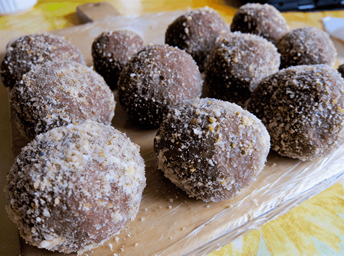Form balls from the mixture. Roll in a mixture of 1 tablespoon of cocoa and 1 tablespoon of ground breadcrumbs.