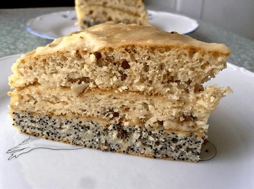 Three-layer cake with nuts, raisins and poppy seeds
