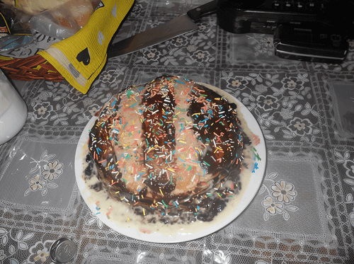Once all the pancakes are coated this way, the edges can be smeared with chocolate icing. The top of the cake can be sprinkled with colorful confectionery sprinkles.
