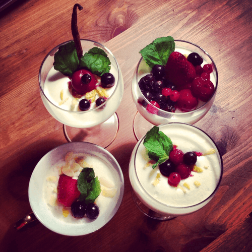 For decoration, slice the strawberries, add a little sugar and a bit of lemon juice, mix until syrupy, and place on top. Add a mint leaf on top.