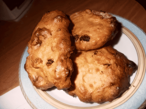 Mix vegetable oil with sugar. Add crushed nuts, raisins, and cinnamon.