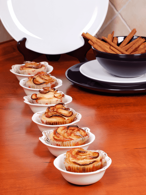 Carefully combine both mixtures, but do not mix too much to avoid a dense dough. Fill the molds three-quarters full. Top with sliced apple pieces and bake in the oven for 16-18 minutes until done. Let cool slightly and remove from the mold.