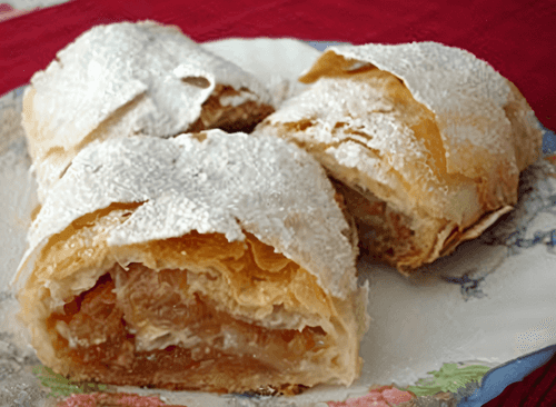 Apple strudels made from phyllo dough are a refined dessert that originated from German cuisine but is gaining popularity worldwide. The light and crispy phyllo dough perfectly complements the juicy apple filling, enhanced by the aroma of cinnamon and caramelized sugar. Historically, strudel has been a symbol of home comfort and festive gatherings, as its preparation requires patience and skill. This dessert is ideal for both cozy family tea times and formal events. It is usually served with powdered sugar or a scoop of vanilla ice cream, making the flavor even richer. The crunchy crust contrasts with the delicate filling, creating a harmony of textures and flavors. Each serving of this strudel is a piece of tradition infused with warmth and aromas of the past.