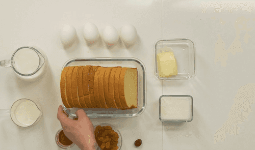 Add some ground nutmeg and pour the mixture into a mold with bread and raisins. Let the future pudding sit for a few minutes.