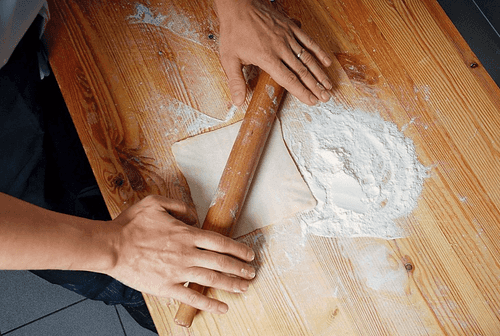 Sprinkle flour on the board and roll out portions of dough with a rolling pin in all directions to make fairly thin squares. Fold the dough in half and roll it out thinly again, repeating this three times. If needed, add a little flour to prevent the dough from sticking to your hands and the board.