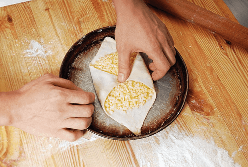 Cut the cheese into large pieces and grate it. Add 20 grams of butter to soften the taste and one egg for viscosity — so that the cheese binds and doesn't leak during baking. Mix thoroughly, but the consistency should remain loose. Place 60 grams of filling on squares of dough and seal the edges in the shape of an envelope.