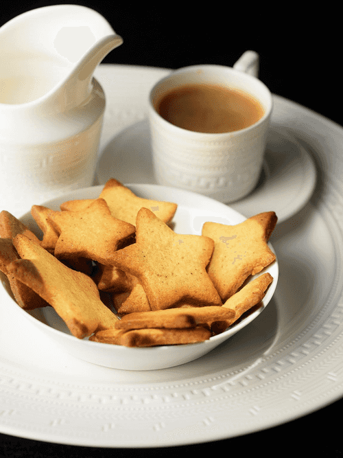 Roll out the chilled dough to a thickness of 1.5 mm in all directions. Use cookie cutters to cut out shaped cookies, transfer them to a baking sheet lined with parchment paper, and place in a preheated oven at 180 degrees for five to eight minutes until lightly browned at the edges.