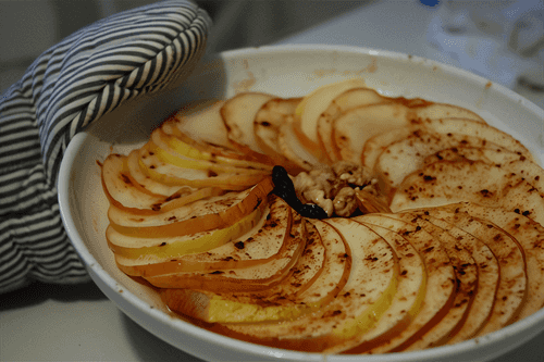 Place nuts and raisins in the center. Drizzle everything with honey.