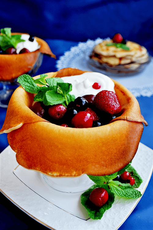 Dessert pancakes with cheese cream and berries are a delicate and aromatic treat from Russian cuisine. Their airy dough, infused with light creamy notes, pairs perfectly with the velvety cheese cream, creating a refined yet cozy indulgence. Berries add freshness and a slight tartness, revealing a palette of flavors and making the dessert particularly harmonious. In Russia, pancakes are traditionally made during Maslenitsa, symbolizing the sun and the arrival of spring. However, this dessert is delightful any time of year – suitable for family tea gatherings, festive feasts, or romantic evenings. Serving with mint leaves makes the dish even more appealing, and each spoonful melts in your mouth, leaving a pleasant aftertaste. The wonderful combination of simplicity and sophistication makes this recipe a true gem of home cooking.