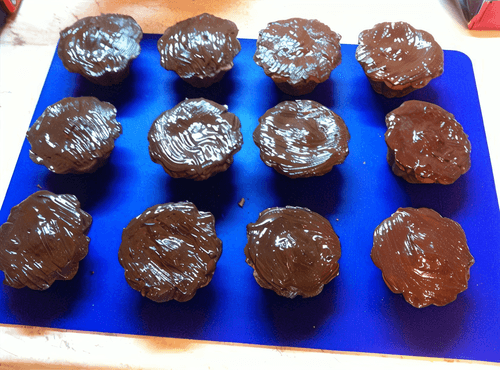 Spread dark chocolate on the surface of the finished cupcakes and let it set slightly.
