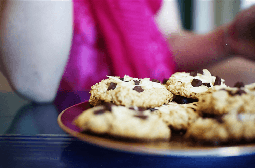 Place in a preheated oven at 190 degrees in the middle. Cook on the top heat for about 10 minutes until the chocolate pieces melt.