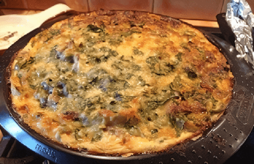 Prepare the filling: beat the eggs, sour cream, milk, and cheese, add garlic (pressed through a garlic press) and a handful of finely chopped herbs (I add parsley).