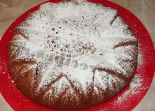 Take the pie out of the oven, let it cool slightly, and sprinkle with powdered sugar.